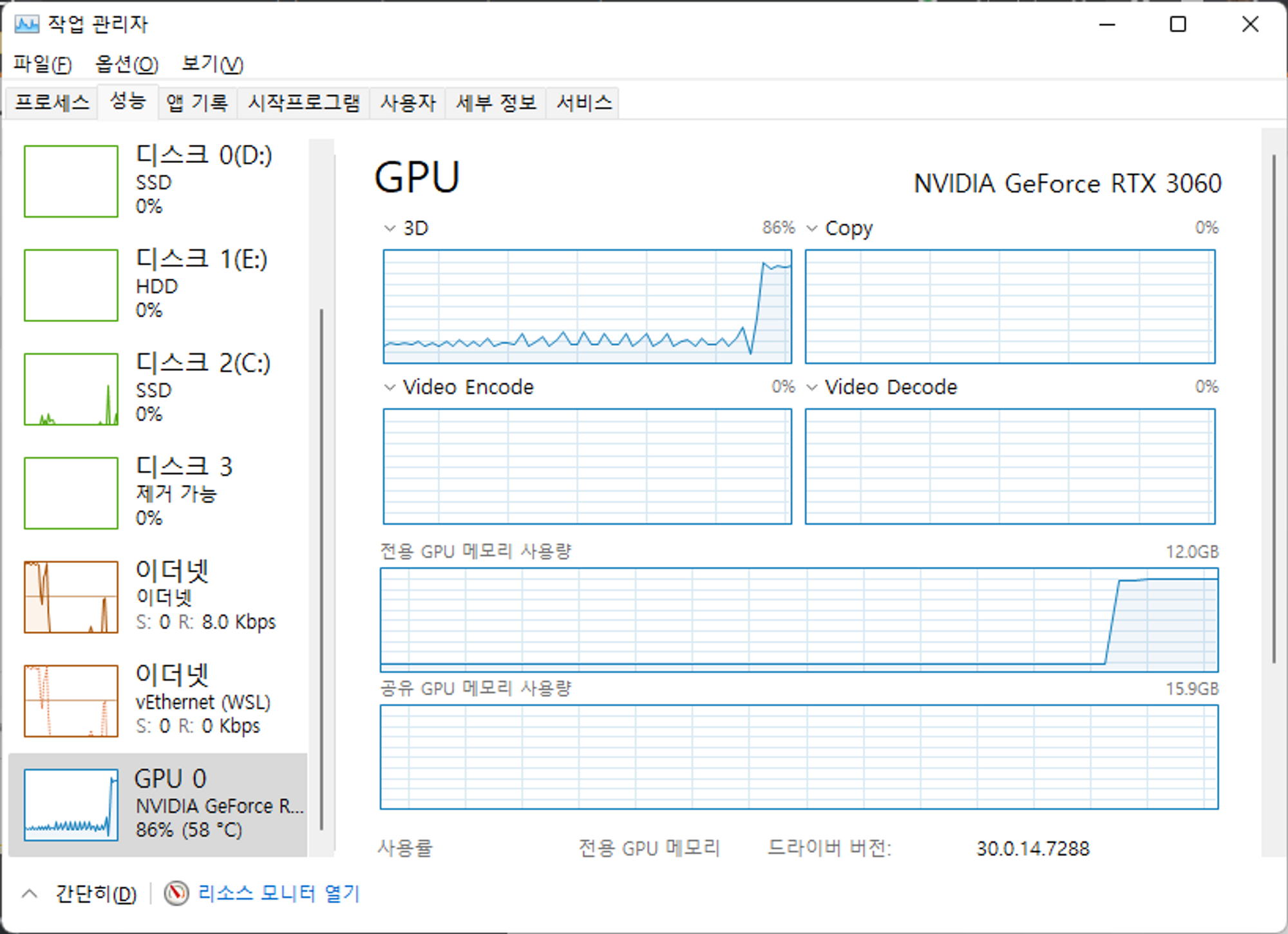 혹은 작업관리자를 옆에 켜두고 코드를 실행시키면 갑자기 그래픽 점유율이 수직상승하는 것을 확인할 수 있습니다.
