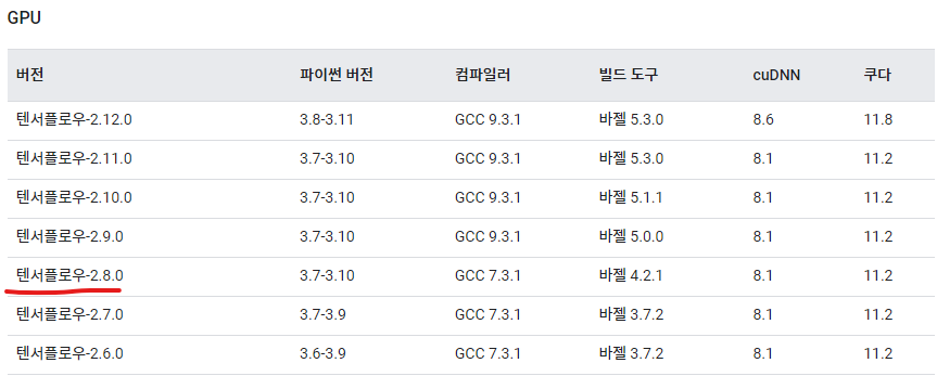 텐서플로우 2.8.0 버전은 쿠다 11.2버전을 지원합니다.