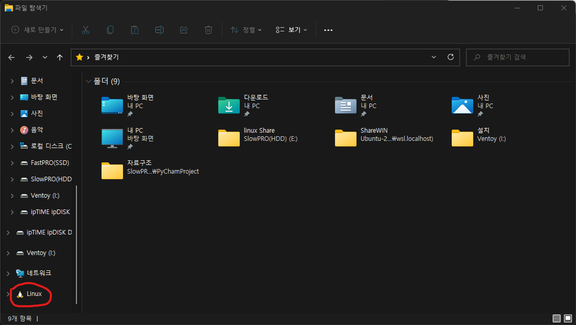 만약 WSL 이 정상 설치되었으면 윈도우 탐색기 왼쪽 사이드바 맨 아래 Linux 라는 카테고리가 생겼을 것이다.
