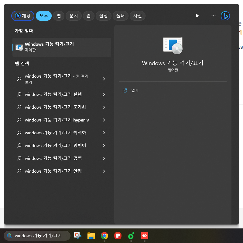 시작에서 "windows 기능 켜기/끄기" 검색