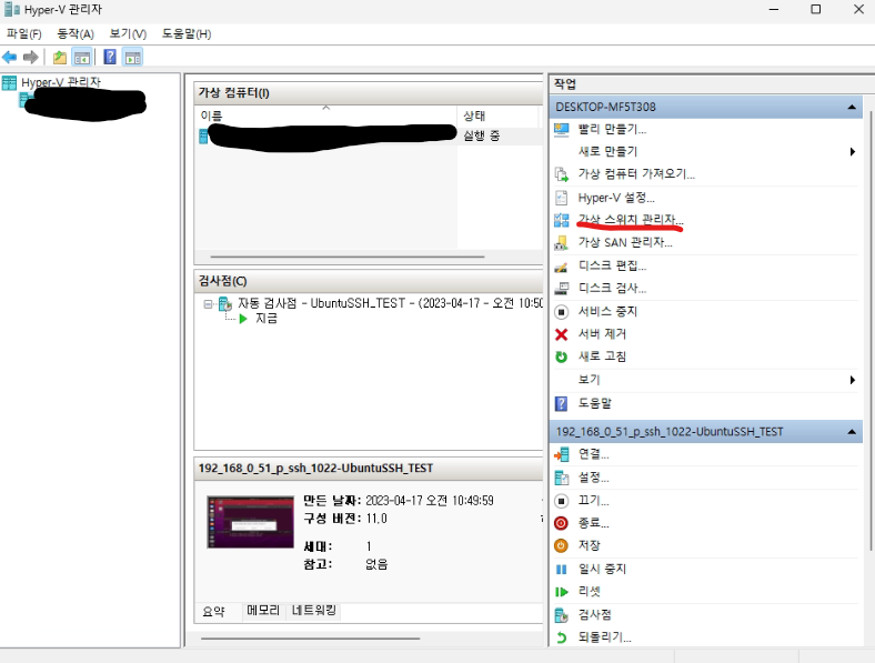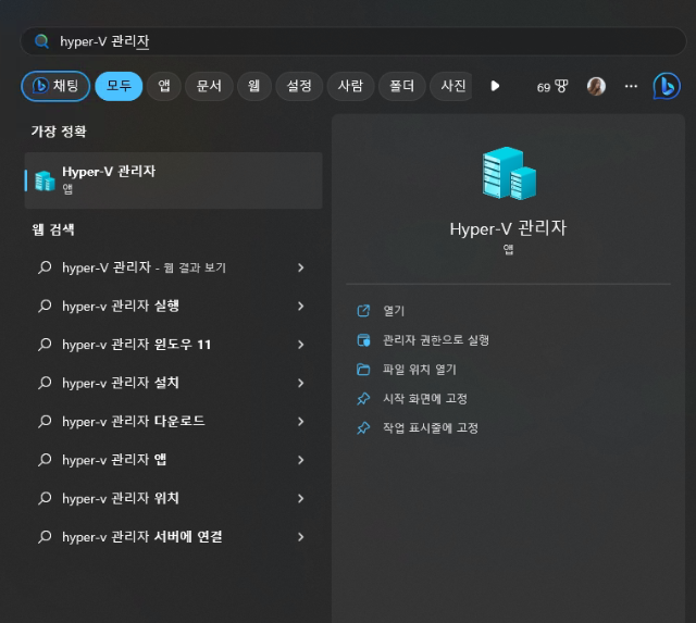 재부팅 후 시작에서 "Hyper-V 관리자" 검색