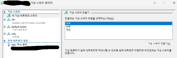 "새 가상 네트워크 스위치" -> "외부" -> "가상 스위치 만들기" 클릭